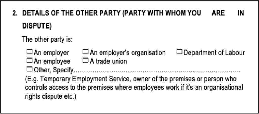 Section 2 - DETAILS OF THE OTHER PARTY: you need to fill in the details of your employer or the employer’s organisation if you know it. Fill in as much as you can here. The more information you can give the CCMA, the easier it will be to process your case.
